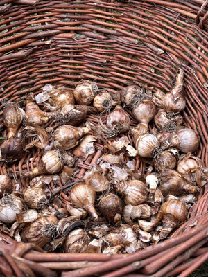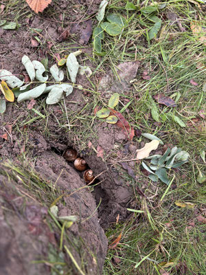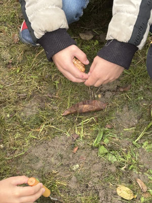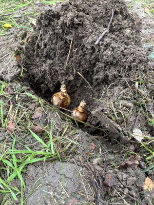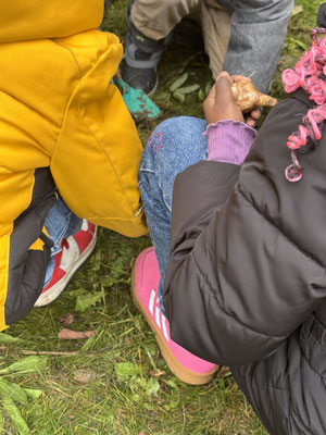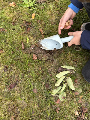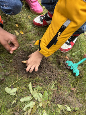 Die Schülerinnen und Schüler gruben mit kleinen Schaufeln oder mit Hilfe eines Spatens kleine Löcher und legten die Blumenzwiebeln in die Erde.